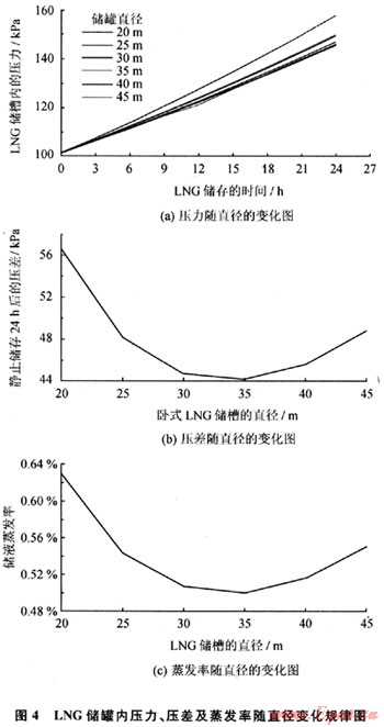 1) 其他條件不變時,隨著儲存時間的增大,LNG儲罐的內(nèi)部壓力也隨之增大;隨著LNG儲罐直徑的增大,LNG儲罐的內(nèi)部壓力先減小,而后壓力增加,速率越來越快,這就必然存在一個最優(yōu)直徑使得艙內(nèi)壓力最小。
