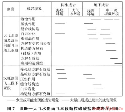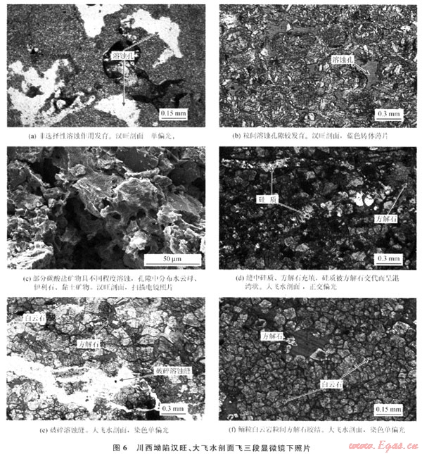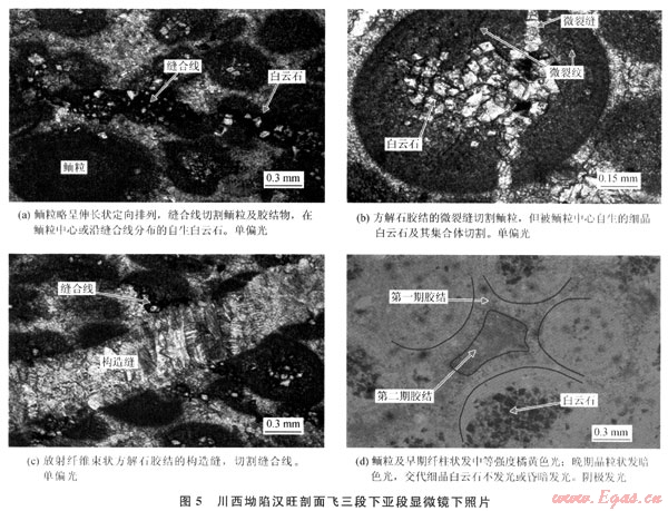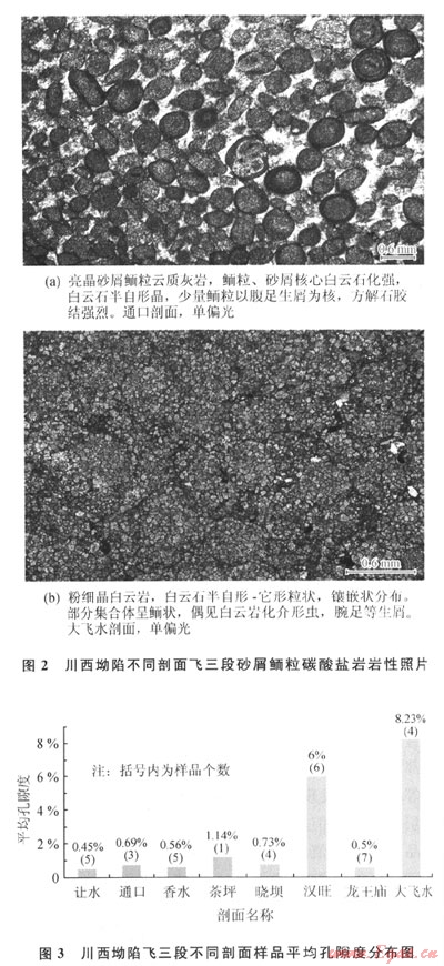 從成巖序列來看,川西坳陷北段南部與南段的成巖作用有明顯的差異,北段南部以海底成巖、淺埋成巖作用為主,而南段大飛水剖面以埋藏成巖作用為主,中、深埋藏成巖作用顯著??傮w上,飛三段成巖作用在平面上由北向南,成巖作用由海底向埋藏成巖變化。北段南部(如漢旺剖面下亞段)經歷了明顯的海底成巖作用,纖維狀等厚環(huán)邊、粒狀方解石膠結普遍發(fā)育,這使原始粒間孔隙顯著減小。在埋藏成巖環(huán)境中,壓實、壓溶和膠結作用使孔隙度進一步降低,而鮞粒內及沿縫合線分布的白云巖化作用,對孔隙度影響較小,使最終孔隙度很低。漢旺剖面上亞段和南段(大飛水剖面)的成巖作用相似,埋藏期的壓實作用較強烈,白云巖化可能均為埋藏成因,重結晶現象較強烈且未發(fā)現同生成巖期大氣水溶蝕作用形成的鮞粒鑄??祝砻骺赡芘c埋藏溶蝕作用有關,中-晚期溶蝕作用是孔隙發(fā)育的重要因素。
