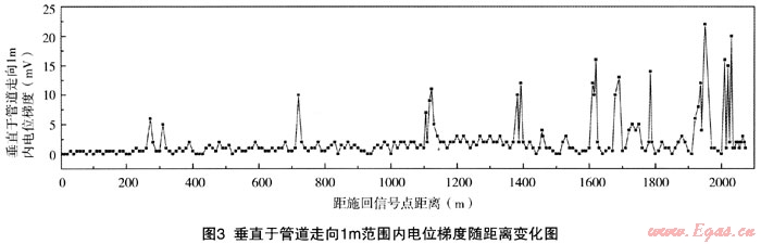 由于公司燃?xì)夤芫W(wǎng)采用了3種防腐材料,3種防腐材料都有這各自的特點:3層PE防腐層絕緣性較好,防腐層沒有破損的情況下不會出現(xiàn)漏電現(xiàn)象,而煤瀝青及冷纏帶防腐層的絕緣性較差,在管道上施加DCVG檢測電流,在管道周邊會出現(xiàn)幾毫伏的微小漏電電位。因此,在試探性檢測后提出以下檢測方案:在管道檢測過程中對3層PE類防腐層采用傳統(tǒng)的DCVG檢測方法即尋找防腐漏點來判斷管道防腐層的好壞。對于采用煤瀝青及冷纏帶防腐的鋼制管道采用檢測垂直于管道走向方向約1m內(nèi)的地表電位差,并繪制管道沿途電位差值與距離的關(guān)系確定管道防腐層的好壞。