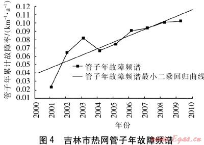 ③ 對吉林市熱力有限公司熱網(wǎng)管子進(jìn)行年故障頻譜分析發(fā)現(xiàn),隨著運行年份的延續(xù),吉林市熱網(wǎng)管子年累計故障率整體呈上升趨勢,且熱網(wǎng)管子年累計故障率的增長速率為0.0079km-1·a-1。