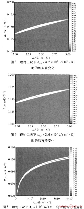 從圖2~4、9~11可知,隨著cp,s的增大,均方差最小區(qū)域對應的風也隨著增大,兩者的正相關系數(shù)為1左右。由于Rb本來就比較小,因此cp,s對其的影響就不能忽略。在以往的數(shù)據(jù)處理方法中,通常只要求cp,s在數(shù)量級上保證106,但這樣往往對鉆孔熱阻有著顯著的影響,進而影響地埋管長度的設計,因此λs還是應盡量接近真實值。