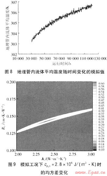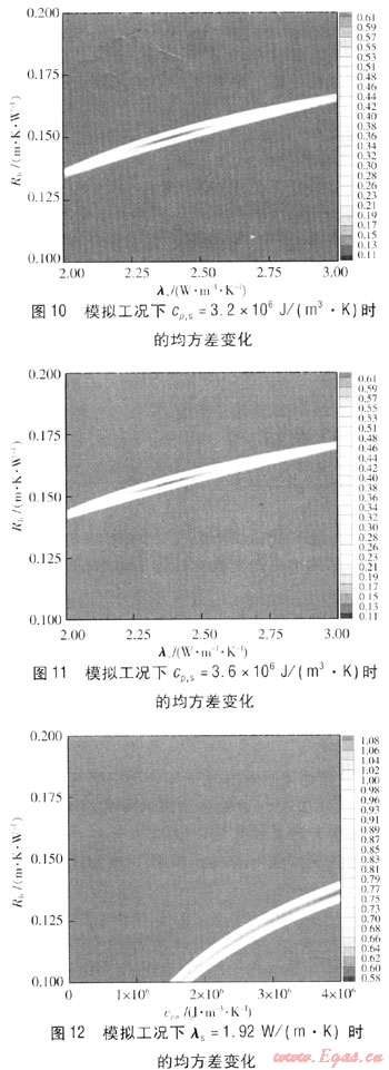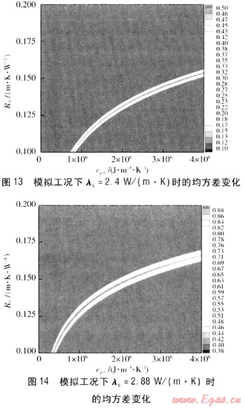 由圖2~4、9~11可知,均方差最小值的區(qū)域基本固定,其對應的λs在2.4W/(m·K)左右。因此,可以得出結論,在實際過程中即使存在一些不確定因素的影響,得到的模擬值與理論值存在一定的偏差,但是經(jīng)過參數(shù)估計處理得到cp,s的變化對結果的影響也很小,cp,s偏差±12.5%對λs的影響在±2%左右。通常情況下cp,s的獲得可以依據(jù)現(xiàn)場鉆孔中心巖土分析來確定,相對誤差一般在±5%以內(nèi),對λs的影響更小。