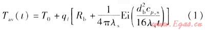地埋管換熱器的傳熱模型主要有線熱源模型、柱熱源模型。線熱源模型是基于1948年Ingersoll和Plass等人發(fā)展的Kelvin線熱源理論[8]。工程上常見的地埋管換熱器的直徑一般為26~36mm,鉆孔深度為40~200m,與鉆孔深度相比,地埋管的直徑很小。在地埋管換熱器工作時,相當于在半無限大介質中,鉆孔中心的一根線熱源與周圍巖土進行熱交換。另外,假設沿地埋管長度方向傳熱量忽略不計,周圍巖土均勻且線熱源與巖土的傳熱量恒定。由于該方法不受具體換熱器形式的限制,計算較簡單,且能滿足一般工程中土壤源熱泵系統(tǒng)設計計算的要求,具有較廣泛的實用性。根據(jù)假設,可以得到地埋管內(nèi)流體平均溫度與鉆孔周圍巖土初始平均溫度及其他參數(shù)之間的關系式[9]: