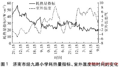 以濟南市經(jīng)九路小學為例,測試日期為2010年1月20日至28日,耗熱量指標、室外溫度隨時間的變化見圖1。