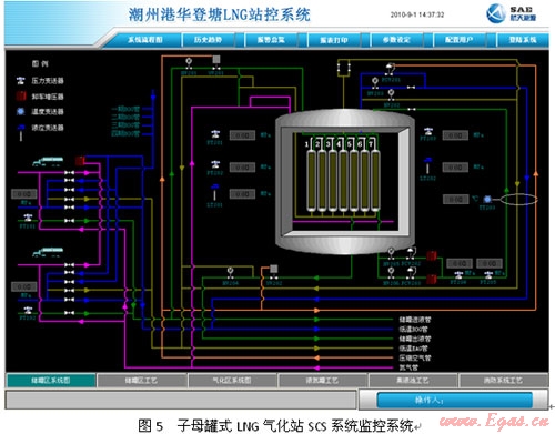 SAE-LSMS系統(tǒng)已成功在國(guó)內(nèi)應(yīng)用多年,2005年深圳美視電廠總管式增壓40kfg,氣化量48,000NM3/H,2007年深圳燃?xì)饧瘓F(tuán)梅林LNG應(yīng)急調(diào)峰站單元式增壓20kfg,氣化量小時(shí)40,000NM3/H,2008年南京港華兩個(gè)2500立方LNG子母罐氣化站均已應(yīng)用該系統(tǒng)。均取得了較好的效果。圖5為廣東潮州子母罐式LNG氣化站SCS系統(tǒng)監(jiān)控畫(huà)面。