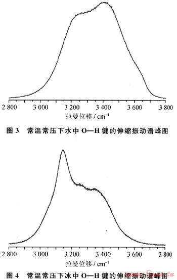 圖3和圖4分別是液態(tài)水和冰的拉曼譜圖。2800~3000cm-1為O—H鍵的伸縮振動(dòng)譜峰,是水的特征譜帶。該區(qū)域內(nèi)寬而高的饅頭峰實(shí)際上是由4個(gè)峰疊加而成的,它們是3241cm-1處的帶氫鍵的O—H鍵的對(duì)稱伸縮振動(dòng)峰,3415cm-1處帶氫鍵的0—H鍵的反對(duì)稱伸縮振動(dòng)峰,3540cm-1處不帶氫鍵的O—H鍵對(duì)稱伸縮振動(dòng)峰以及3617cm-1處不帶氫鍵的O—H反對(duì)稱伸縮振動(dòng)峰[8~11]。各個(gè)峰位代表了分子轉(zhuǎn)動(dòng)或振動(dòng)的頻率,揭示了原子間距和作用力的信息。2800~3000cm-1區(qū)域內(nèi)各個(gè)峰所占的比例,反映了水中氫鍵斷裂的數(shù)目。從圖3可以看出,液態(tài)水中原子間距較大,形成的氫鍵較少,所以3241cm-1和3415cm-1處峰所占比例較小。而圖4所示的冰的拉曼譜圖中,3540cm-1和3617cm-1,處的拉曼峰幾乎消失,這主要是因?yàn)楸兴肿油ㄟ^(guò)氫鍵構(gòu)成了四面體結(jié)構(gòu),原子間距較小,氫鍵數(shù)目較多,因而3241cm-1和3415cm-1處峰所占比例較大。