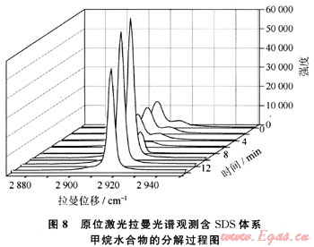 圖8是由SDS水溶液合成的甲烷水合物的分解過(guò)程拉曼譜圖。譜圖范圍在2850~2950cm,主要觀測(cè)了水合物的分解過(guò)程中甲烷分子的拉曼譜圖變化。從圖中可以看出,由SDS溶液合成的甲烷水合物也為Ⅰ型結(jié)構(gòu)水合物,與干水甲烷水合物分解過(guò)程類似,隨著水合物的不斷分解大、小籠中甲烷分子的拉曼雙峰發(fā)生了與干水甲烷水合物相同的變化,甲烷雙峰呈現(xiàn)此消彼長(zhǎng)的過(guò)程,并最終變?yōu)閱畏濉?/span>