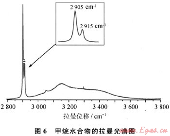 氣體水合物的結(jié)構(gòu)有以下4種:Ⅰ型(立方晶體結(jié)構(gòu))、Ⅱ型(菱形晶體結(jié)構(gòu))、H型(六方晶體結(jié)構(gòu))以及新近發(fā)現(xiàn)的T型(它是由生物分子和水分子生成的),其中前面3種較為常見(jiàn)。Ⅰ型結(jié)構(gòu)含46個(gè)水分子和最多8個(gè)氣體分子,Ⅱ型結(jié)構(gòu)含136個(gè)水分子和最多24個(gè)氣體分子,H型結(jié)構(gòu)含34個(gè)水分子和最多6個(gè)氣體分子。對(duì)水合物結(jié)構(gòu)進(jìn)行分析,主要采用激光拉曼光譜、核磁共振和X-衍射法。Sum等[12]的研究表明激光拉曼光譜是一個(gè)很有潛力的測(cè)定水合物晶體結(jié)構(gòu)的工具,它可以測(cè)定水合物晶腔中氣體分子的伸縮振動(dòng)的拉曼位移(Raman Shift),而且拉曼強(qiáng)度與分子的數(shù)量成正比。圖6為實(shí)驗(yàn)測(cè)得的甲烷水合物的拉曼譜圖,小圖中2905cm-1和2915cm-1附近分別是處于大、小籠中甲烷分子的伸縮振動(dòng)拉曼峰。純甲烷氣體的拉曼譜峰在2917cm-1附近,水合物中甲烷分子的伸縮振動(dòng)峰發(fā)生分裂呈現(xiàn)雙峰,而且向低波數(shù)遷移,這主要是由于水合物中甲烷分子填充在水分子通過(guò)氫鍵構(gòu)建起來(lái)的籠子中,甲烷分子與大、小籠之間的相互作用不同,所處的化學(xué)環(huán)境存在差異,從而使得甲烷的拉曼譜峰發(fā)生分裂。甲烷分子化學(xué)環(huán)境的差異也說(shuō)明甲烷水合物中兩種籠型結(jié)構(gòu)的存在。實(shí)驗(yàn)測(cè)得甲烷水合物大、小籠拉曼峰強(qiáng)度(峰面積)的比值基本上都為3:1,這與工型結(jié)構(gòu)水合物晶胞中大、小籠的個(gè)數(shù)比是一致的(工型結(jié)構(gòu)一個(gè)晶胞中包括6個(gè)籠和2個(gè)小籠),由此可以斷定甲烷水合物為工型結(jié)構(gòu)水合物。水合物的拉曼譜圖中,3078cm-1附近的峰是O—H鍵的伸縮振動(dòng)位移,是水合物中與氣體分子相結(jié)合的水的拉曼峰。根據(jù)甲烷雙峰和結(jié)構(gòu)水峰可以很容易地將水合物與自由氣以及冰加以區(qū)分。