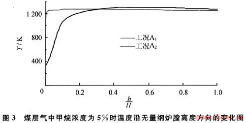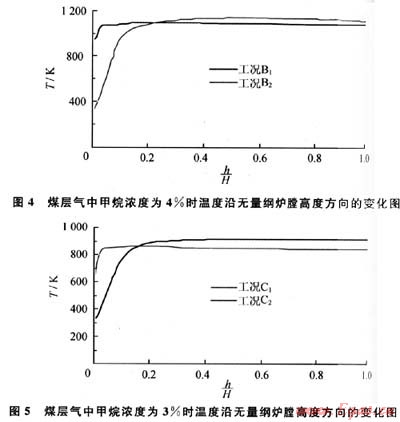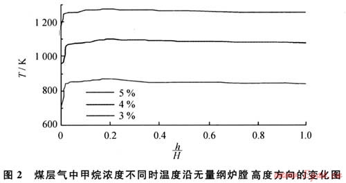 在3種工況條件下,h/H大于0.05時爐膛溫度均大于840K,而甲烷的著火溫度為811K。當(dāng)爐膛的溫度大于甲烷的著火溫度時就可以維持燃燒,這說明在煤層氣中甲烷濃度不低于3%時,利用流態(tài)化蓄熱裝置可以維持燃燒。對計算區(qū)域溫度取平均值并定義為爐膛的平均溫度,當(dāng)煤層氣中甲烷濃度為5%、4%、3%時,爐膛的平均溫度分別為1256K、1080K、842K。煤層氣中甲烷濃度由5%下降到4%時,爐膛平均溫度下降,溫度下降值△T1為176K;煤層氣中甲烷濃度由4%下降到3%時溫度下降值△T2為238K。可見,隨著煤層氣中甲烷濃度的下降,溫度降低,并且下降幅度有增大趨勢,可以判斷,當(dāng)煤層氣中甲烷濃度低于3%時,爐膛溫度迅速降低并低于甲烷的著火溫度811K,無法維持煤層氣在爐膛中的燃燒,這和數(shù)值模擬中當(dāng)煤層氣中甲烷濃度低于3%時不能燃燒的計算結(jié)果是一致的。所以流化床蓄熱裝置燃燒超低濃度煤層氣的著火極限濃度為3%。