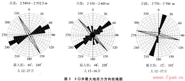 3口井測量井段內(nèi)橢圓井眼現(xiàn)象不太明顯,地應(yīng)力較均衡,在不同時期構(gòu)造形成過程中略有變化,確定的主應(yīng)力方向為北東-南西向(圖3)。