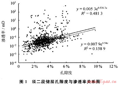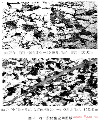 由須二段儲層孔隙度與滲透率的關系圖(圖1)可見,隨著孔隙度的增大滲透率有變好的趨勢,但孔滲相關性較差,這說明須二段儲層基質(zhì)孔滲相關性較好,同時儲層存在一些與孔隙空間關系較小的額外滲濾通道,這些滲濾通道使得須二段滲透率值的增加對孔隙度增加的依賴很小。由薄片鑒定可推斷新場須二段儲層的額外滲濾通道為裂縫(圖2)。工業(yè)氣流的產(chǎn)出對裂縫的依賴程度很高[1~3]。