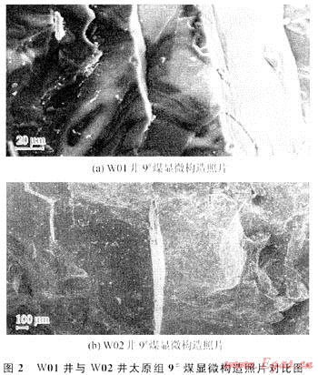 通過WO1井和W02井煤樣品的顯微構(gòu)造照片對比,可清楚地觀察到兩口鉆孔巖心顯微構(gòu)造的明顯差異。WO1井所處的構(gòu)造位置是應(yīng)力場低值分布區(qū),煤巖割理裂隙十分發(fā)育。圖2-a顯示出在大約100μm長度范圍內(nèi)分布有條微裂隙,裂縫明顯地具有張剪性力學(xué)特性;而W02井由于處應(yīng)力場高值分布區(qū),煤巖裂縫分布密度低且為閉合(圖2-b)。