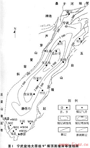 寧武盆地位于山西省西北部,西側(cè)為呂梁山隆起和蘆芽山復(fù)背斜,東側(cè)為五臺山隆起帶,是晚古生代成煤期后受構(gòu)造運(yùn)動擠壓抬升形成的小型山間構(gòu)造盆地[1~2]。南北長約130km,寬20~30km,面積約3120km2(圖1)。目前已有3口煤層氣井最高日產(chǎn)氣超過1000m3(WO1、W04、W05井),均分布于南部斜坡帶,證實寧武盆地南部具有很好的煤層氣勘探潛力。但寧武盆地南部煤層氣富集主控因素尚不清楚,需要深入研究,筆者通過對該區(qū)構(gòu)造特征、地應(yīng)力分布特征、封蓋條件等方面的研究,分析了寧武盆地南部煤層氣富集主控因素,指出了煤層氣有利富集區(qū)。