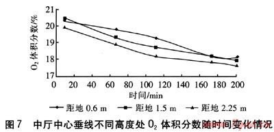 中廳中心垂線上的3個測點中,C0最高體積分?jǐn)?shù)為0.176%,02最低體積分?jǐn)?shù)為17.6%,C02最高體積分?jǐn)?shù)為2.1%,均出現(xiàn)在距地2.25m處的測點上。中廳C0、C02體積分?jǐn)?shù)隨時間的增加呈上升趨勢,02體積分?jǐn)?shù)隨時間的增加而下降。在同一垂線,距地面2.25m處的C0、C02體積分?jǐn)?shù)略高于1.5m和0.6m處,這說明隨煙氣溫度的降低,向上浮力減弱。