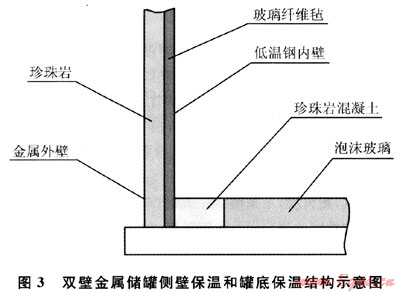 罐頂現(xiàn)多采用外罐拱頂加內(nèi)罐鋁吊頂結(jié)構(gòu)(圖2),其絕熱結(jié)構(gòu)與施工相對(duì)簡單。儲(chǔ)罐側(cè)壁保冷結(jié)構(gòu)如圖3所示。20世紀(jì)80年代以前,大多為單一的松散珍珠巖,其缺點(diǎn)是設(shè)備降溫后,內(nèi)壁收縮使得罐側(cè)壁的上部及頂?shù)倪吘墔^(qū)域缺少珍珠巖,所需二次填充量很大,填充時(shí)間也較長,致使內(nèi)外罐間進(jìn)入大量的空氣,并使得許多水分在兩罐之間的空氣內(nèi)冷凝下來,加劇了設(shè)備的腐蝕。另外,珍珠巖受潮,導(dǎo)熱系數(shù)將變大,使操作期間冷藏液的蒸發(fā)量增加,加大了制冷機(jī)的負(fù)荷,增加了操作成本。20世紀(jì)80年代后期建設(shè)的雙層低溫罐多數(shù)都在內(nèi)罐的外壁增加一層彈性保溫氈,這層氈在松散珍珠巖側(cè)壓力的作用下被壓縮,當(dāng)內(nèi)罐降溫時(shí),彈性氈回彈,以此來補(bǔ)償罐的收縮量,大大減少了二次填充量,即避免了二次填充。填充物——彈性氈是由玻璃棉制成的,其回彈量等于罐的收縮量,可以很容易計(jì)算出來。對(duì)于罐底絕熱保溫結(jié)構(gòu)設(shè)計(jì),不但要保證儲(chǔ)罐的冷損失率降至最小,而且保溫材料還要具有足夠的抗壓強(qiáng)度來支撐儲(chǔ)罐和介質(zhì)重量。根據(jù)罐底受力情況和最大限度降低冷損失率,建議將底部絕熱保溫結(jié)構(gòu)分成周邊圈梁和中心圓形隔熱區(qū)兩部分,參見圖3[15]。