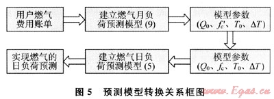 通常,燃?xì)庳?fù)荷的月負(fù)荷預(yù)測模型比較容易建立。因?yàn)?,通過統(tǒng)計(jì)待預(yù)測地區(qū)的月燃?xì)赓M(fèi)用賬單,就能夠比較方便地建立月負(fù)荷預(yù)測模型。相反,由于目前我國城市燃?xì)庳?fù)荷計(jì)量體系尚不完備,因此燃?xì)馊肇?fù)荷計(jì)量數(shù)據(jù)的收集較為困難,這也給燃?xì)馊肇?fù)荷的預(yù)測帶來諸多不便。所以我們可以利用上述方法,通過預(yù)測模型(9)來間接地得到燃?xì)馊肇?fù)荷預(yù)測模型,從而實(shí)現(xiàn)燃?xì)馊肇?fù)荷預(yù)測。其轉(zhuǎn)換關(guān)系如圖5所示。
