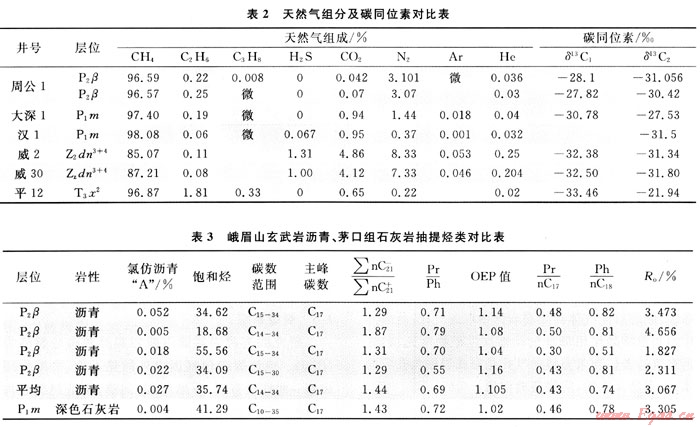 周公山玄武巖氣藏生產(chǎn)至今已愈17a,屬次生氣藏為學(xué)界共識(shí),但氣源來自何層尚有歧義[3、5]。據(jù)表2可知,周公1井玄武巖與威遠(yuǎn)震旦系氣組成差別大,后者N2、CO2、H2S、He含量高,CH4低,多數(shù)人認(rèn)為氣源主要來自寒武系筇竹寺組,而川西南部地區(qū)受加里東運(yùn)動(dòng)影響,該套烴源巖剝蝕,殘余厚度僅0~70m。天然氣碳同位素揭示,玄武巖天然氣具油型氣特征,與川西南部上三疊統(tǒng)天然氣碳同位素有明顯差異。地面露頭地化分析(表3)表明,玄武巖瀝青苗的飽和烴色譜均以正構(gòu)烷烴為主,主峰都為nC17奇碳數(shù)優(yōu)勢(shì),Pr/Ph為0.69、Pr/nC17為0.43、Ph/nC18為0.74、∑nC21-/∑nC21+為1.44、Ro為3.067%,與下伏的下二疊統(tǒng)石灰?guī)r具良好的親緣關(guān)系,推測(cè)烴源來自下二疊統(tǒng)。