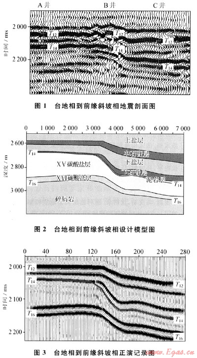 研究區(qū)3口測(cè)井資料對(duì)碳酸鹽巖頂界(T14)的標(biāo)定結(jié)果見(jiàn)圖1。從圖中可見(jiàn):臺(tái)地相和前緣斜坡相的碳酸鹽巖頂界并不在同一相位上。這對(duì)進(jìn)一步的追蹤和解釋帶來(lái)了不確定性?;趨^(qū)域地質(zhì)和鉆測(cè)井資料分析,設(shè)計(jì)了沉積相變區(qū)地震地質(zhì)模型(圖2):臺(tái)地相ⅩⅥ碳酸鹽巖層厚度為50~70m,ⅩⅤ碳酸鹽巖層厚度為300~360m,下石膏層厚度為8~15m,下鹽層厚度為70~100m,中石膏層厚度為30~50m;前緣斜坡相ⅩⅥ碳酸鹽巖層厚度為40~60mm,ⅩⅤ碳酸鹽巖層厚度為80~180m,泥巖層厚度為4~38m,下石膏層厚度為20~80m,下鹽層厚度為40~200m,中石膏層厚度為100~140m;中下侏羅統(tǒng)速度為4100m/s,密度為2.40g/cm3;ⅩⅥ碳酸鹽巖層速度為5900m/s,密度為2.75g/cm3;ⅩⅤ碳酸鹽巖層速度為5600m/s,密度為2.65g/cm3;泥巖層速度為4200m/s,密度為2.45g/cm3;下石膏層和中石膏層的速度為6000m/s,密度為2.96g/cm3;下鹽層和上鹽層速度為4500m/s,密度為2.50g/cm3。取Ricker子波作為入射脈沖,依據(jù)實(shí)際地震資料選取的地震波主頻為30Hz。通過(guò)波動(dòng)方程正演計(jì)算,得到的理論地震記錄見(jiàn)圖3。