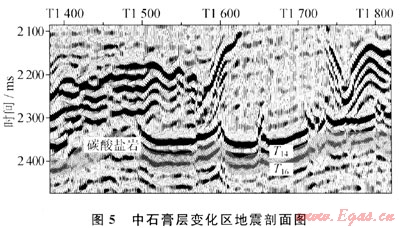 由圖7可見(jiàn),在中石膏層受擠壓消失或減薄的區(qū)域,碳酸鹽巖頂?shù)捉缑嬖跁r(shí)間剖面上出現(xiàn)下拉,形成“眼球”;如果鹽巖中存在石膏夾塊,則引起下覆碳酸鹽巖頂?shù)追瓷渫噍S錯(cuò)斷,這顯然會(huì)使解釋進(jìn)入誤區(qū)。由此可提示,在石膏層變形較強(qiáng)烈的地區(qū),地震解釋要特別關(guān)注中石膏缺失和減薄的區(qū)域。