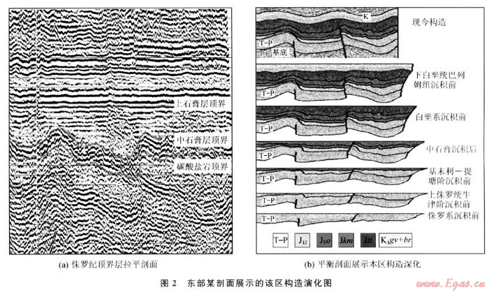 在上侏羅統(tǒng)卡洛夫-牛津階沉積完畢之后,圖蘭地臺(tái)回返,中央卡拉庫姆隆起抬升,而阿姆河盆地區(qū)域則繼續(xù)沉降,由此形成了盆地區(qū)域內(nèi)封閉的海洋沉積環(huán)境。沉積了巨厚的鹽膏層。從地震剖面上可以清楚地反映出該套鹽膏層受擠壓后流動(dòng)變形的形態(tài),以往的認(rèn)識(shí)認(rèn)為[4],鹽膏層發(fā)生塑性流動(dòng)的擠壓力是由晚古近世開始的新構(gòu)造運(yùn)動(dòng)作用的結(jié)果。但通過平衡剖面和層拉平剖面技術(shù)清晰地反映出了在該套鹽膏層中部的中石膏沉積完畢之后即發(fā)生一期強(qiáng)烈的構(gòu)造運(yùn)動(dòng),該期構(gòu)造運(yùn)動(dòng)不僅僅使鹽膏層發(fā)生塑性流動(dòng)而形變。更重要的是本區(qū)的構(gòu)造格局因此而改變,同時(shí)本區(qū)部分構(gòu)造圈閉也在此時(shí)形成。