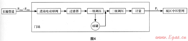高壓球罐最高工作壓力一般為1.6MPa,長(zhǎng)輸管道進(jìn)入門(mén)站壓力若高于1.6MPa,應(yīng)設(shè)置兩級(jí)調(diào)壓系統(tǒng)。