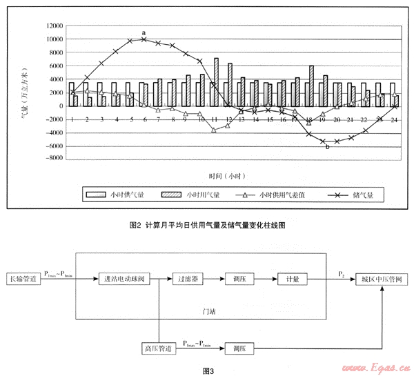 如果利用長(zhǎng)輸管道末段儲(chǔ)氣,儲(chǔ)氣容積等于末段管路內(nèi)最高平均壓力和最低平均壓力下的氣體容積差。為保證最大的儲(chǔ)氣能力,長(zhǎng)輸管道終點(diǎn)壓力即門(mén)站調(diào)壓器進(jìn)口壓力應(yīng)降低到最小值。通常調(diào)壓器正常工作的進(jìn)口最小壓力應(yīng)高于出口壓力0.05MPa。但同時(shí)調(diào)壓器進(jìn)口壓力降低,其通過(guò)能力隨之降低。為避免調(diào)壓器出現(xiàn)不穩(wěn)定的情況,一般設(shè)計(jì)按照城市高峰小時(shí)流量選調(diào)壓器尺寸,無(wú)疑會(huì)加大規(guī)格或者增加并聯(lián)調(diào)壓器數(shù)量,投資隨之加大。但末端壓力最低時(shí)并不是用氣高峰階段。圖2為某城市用氣量和儲(chǔ)氣量變化曲線(xiàn)圖。
