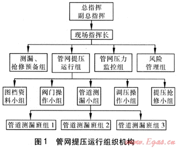 管網(wǎng)提壓運(yùn)行指揮部由公司分管運(yùn)行副總經(jīng)理任總指揮,分管工程副總經(jīng)理任副總指揮。指揮部下設(shè)管網(wǎng)提壓運(yùn)行組、管網(wǎng)壓力監(jiān)控組、測(cè)漏、搶修預(yù)備組、風(fēng)險(xiǎn)管理組,另外公司相關(guān)職能部門(mén)如財(cái)務(wù)、采購(gòu)、行政等管理部門(mén)按其職能給予配合。管網(wǎng)提壓運(yùn)行組,按工作職能具體劃分為閥門(mén)操作小組、調(diào)壓操作小組、提壓搶修小組、管道測(cè)漏小組、圖檔資料小組等5個(gè)小組。管道測(cè)漏小組根據(jù)區(qū)域管網(wǎng)提壓長(zhǎng)度及現(xiàn)有測(cè)漏人員和測(cè)漏儀器工具情況,可具體劃分為若干班組。管網(wǎng)提壓運(yùn)行組織機(jī)構(gòu)見(jiàn)圖1。