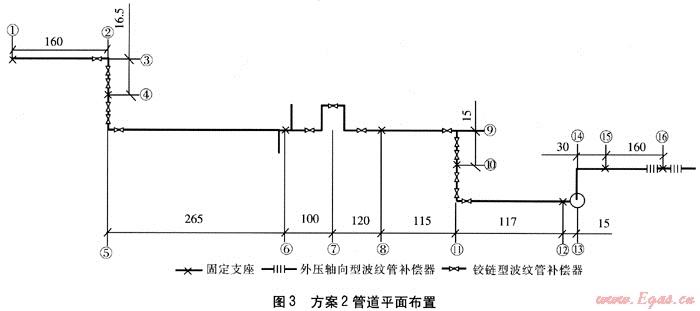 將方案1中節(jié)點1~15與方案2進(jìn)行對比可知,方案1共有固定支座10個,其中2、5、9、15為大推力固定支座,而方案2在平面轉(zhuǎn)角處利用鉸鏈型波紋管補償器,加大補償段長度,并在中間長直管段上利用管道穿越障礙埋設(shè)較深的條件,設(shè)置豎向方形彎利用鉸鏈型波紋管補償器補償直管段熱伸長,減少了大推力固定支座數(shù)量。