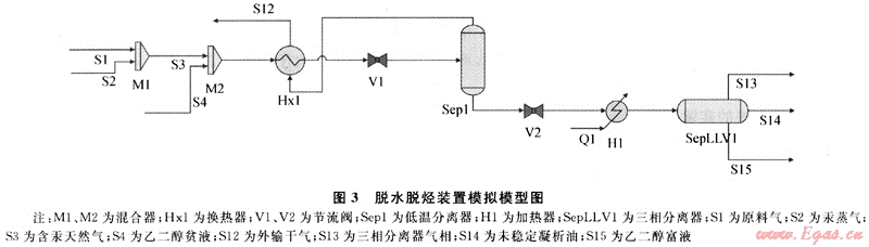由于低溫分離器等設(shè)備處于脫水脫烴裝置的作業(yè)流程內(nèi)部,不可能在裝置運(yùn)行過程中實時采樣,所以采用VMGSim軟件對脫水脫烴裝置中汞的分布進(jìn)行模擬(VMGSim軟件是目前國內(nèi)外唯一能對微量金屬元素在工業(yè)流程中的分布情況進(jìn)行模擬的專業(yè)軟件)。