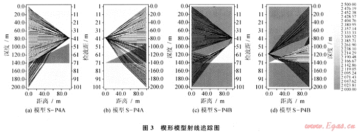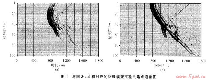 圖3為兩個楔形模型的射線追蹤圖,比較可以發(fā)現(xiàn),對于尖滅傾斜層來說,激發(fā)井相對地層為下傾或接收井相對地層為上傾時(圖3-b、圖3-d),其經(jīng)過尖滅傾斜層射線明顯多于上傾激發(fā)或上傾接收(圖3-a、圖3-c)。顯而易見,利用下傾激發(fā)上傾接收的井間資料進(jìn)行偏移成像或?qū)游龀上?,其得到的結(jié)果肯定優(yōu)于上傾激發(fā)下傾接收的結(jié)果。圖4是與圖3-c、3-d對應(yīng)的物理模型實(shí)驗(yàn)炮集記錄,也表現(xiàn)出同樣的結(jié)果。數(shù)值模擬和物理模擬結(jié)果均表明下傾激發(fā)、上傾接收得到的井間記錄能更好地反映井間介質(zhì)的變化。