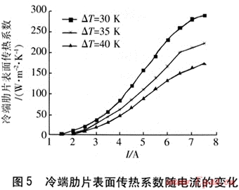 ① 保持冷端溫度10℃和環(huán)境溫度30℃不變,對(duì)應(yīng)不同冷熱端溫差時(shí),冷端肋片表面?zhèn)鳠嵯禂?shù)隨電流的變化見圖5。由圖5可知,電流小于7.5A,冷熱端溫差及環(huán)境溫度一定時(shí),要維持冷端溫度恒定,冷端肋片表面?zhèn)鳠嵯禂?shù)隨著電流的增加而增大。不同冷熱端溫差,冷端肋片表面?zhèn)鳠嵯禂?shù)差別較大,溫差越小,冷端肋片表面?zhèn)鳠嵯禂?shù)越大。