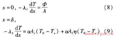 根據(jù)文獻(xiàn)[7],肋片中的發(fā)熱源項(xiàng)可表示為:
