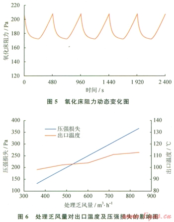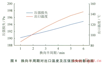 圖8描述的是換向半周期與氧化床壓強損失及出口溫度之間的關(guān)系(乏風量為