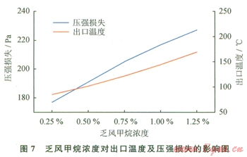 圖7給出了氧化床壓強損失和出口溫度隨進口乏風甲烷濃度的變化圖,模擬時保持上述模擬換向半周期(2 min)不變,將乏風量設置為