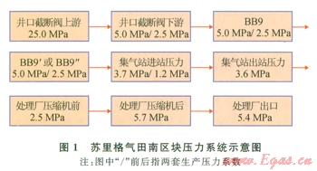 南區(qū)塊與蘇里格氣田其他區(qū)塊共用天然氣處理廠,區(qū)塊壓力級(jí)制與其他區(qū)塊基本一致(圖1),即井口截?cái)嚅y及上游設(shè)計(jì)壓力為25.0 MPa。井口截?cái)嚅y下游、采氣管線設(shè)計(jì)壓力為6.3 MPa。集氣站設(shè)計(jì)壓力為4.5 MPa,集氣干線、集氣支線設(shè)計(jì)壓力為4.5MPa,注醇管線設(shè)計(jì)壓力為8.0 MPa。