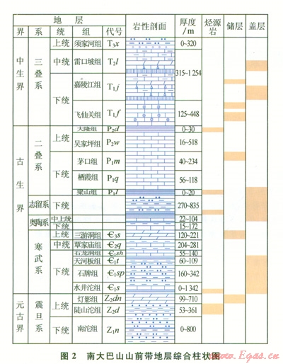 該區(qū)主要經(jīng)歷了2個大的沉積—構(gòu)造演化階段:震旦紀(jì)—中三疊世為海相臺地—臺緣沉積—構(gòu)造演化階段;晚三疊世—始新世為陸相碎屑沉積盆地沉積—構(gòu)造演化階段??傮w上缺失上志留統(tǒng)一石炭系,其他層位較為齊全。發(fā)育4套構(gòu)造—地層沉積組合:①基底組合(Pt);②臺地(臺緣)組合(Z—S);③臺地—裂陷邊緣組合(P—T2);④前陸盆地組合(T3x—J)。