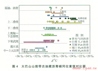 高演化烴源巖的生物標(biāo)志化合物在油源對比工作中存在很多不確定性,而不同時代烴源巖干酪根和抽提物同位素組成之間有明顯的差異,是油源和氣源對比的一種現(xiàn)實(shí)方法。南方海相古生界烴源巖中干酪根碳同位素值變化非常有規(guī)律,從中上元古界到上古生界,干酪根的碳同位素值由輕變重。該區(qū)古油藏瀝青和油苗的碳同位素值分布,均與上二疊統(tǒng)泥巖氯仿瀝青“A”的碳同位素值接近(圖4),表明它們之間具有親緣性。