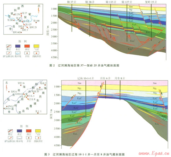2)灘海西部地區(qū)油氣分布層間差異大,油氣藏類型變化快,油氣藏主要沿砂體和斷裂分布;中部地區(qū)油氣主要分布在斷裂發(fā)育且封蓋條件較好的層位,油氣性質(zhì)差異明顯;東部地區(qū)以發(fā)育氣藏為主,平面上分布穩(wěn)定,具有油氣分布井段長、砂體延伸范圍小、相變快的特點,不同斷塊、不同組段油氣發(fā)育程度差異大,并以中淺部層系多套氣藏疊置發(fā)育為主。
