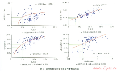 通過蘇東地區(qū)壓汞資料分析認為,壓汞汞驅(qū)替巖樣中潤濕相的過程與地下氣相驅(qū)替地層水的過程是相似的[7]。當試驗壓力轉(zhuǎn)化為喉道半徑后,可得到每塊巖樣的含汞(氣)飽和度與喉道半徑之間的相關(guān)關(guān)系(表1);再根據(jù)該樣品實測的孔隙度、滲透率值,可得到孔隙度、滲透率、喉道半徑、含汞(氣)飽和度4者的關(guān)系圖(圖4)。