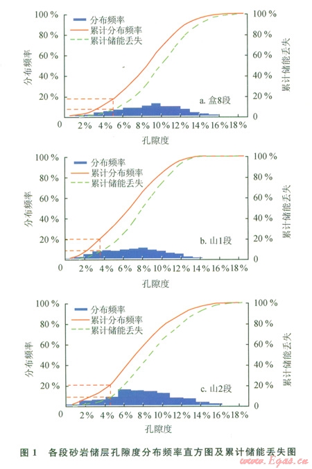 經(jīng)對蘇東地區(qū)盒8段、山1段、山2段的物性特征、巖性特征和孔隙結(jié)構(gòu)特征分析,認為該區(qū)儲層為典型的中低孔-低孔、低滲-特低滲儲層。孔隙度為5%~l5%,滲透率為0.1~1.0 mD,滲透率能力較差。按照經(jīng)驗統(tǒng)計法(圖1、2),考慮到長慶油田低孔、低滲的儲層特點,按照累計頻率丟失不超過總累計的20%,累計儲能、產(chǎn)能丟失不超過總累計的l0%。當