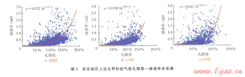 根據(jù)單層試氣井試氣資料,在產(chǎn)能一定的情況下,就可以計算出蘇東地區(qū)主力氣層段產(chǎn)工業(yè)氣的滲透率下限(表3)。根據(jù)目前蘇東地區(qū)天然氣儲量規(guī)范,2 000~3