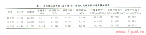 根據(jù)蘇東地區(qū)儲層物性,擁有70%以上可供油氣通過的喉道及其所控制的孔隙空間體積為基質(zhì)產(chǎn)氣提供條件,這時所對應(yīng)的孔喉半徑值作為最小流動孔喉半徑[7]。根據(jù)蘇東地區(qū)氣藏樣品壓汞資料分析(表1),可得出以下結(jié)論:盒8段、山1段最小流動孔喉半徑定為0.05µm,山2段最小流動孔喉半徑定為0.02 µm。
