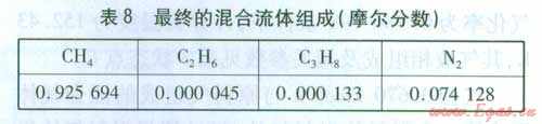 初始運(yùn)行時(shí),原料氣冷卻所需冷量由外加制冷劑提供。當(dāng)換熱器3出口的天然氣溫度達(dá)到203.15 K時(shí),天然氣從拉法爾噴管噴出并進(jìn)入引射器,由于沒有被引射氣體,故此刻僅以原料氣組分從引射器出口流出,控制其出口溫度使之在1.2 MPa壓力下的氣化率為0.67。通過比較計(jì)算結(jié)果和實(shí)驗(yàn)結(jié)果,可得出用SRK方程計(jì)算烴類混合物的氣液相平衡是可靠的H 3,本文選用SRK方程計(jì)算天然氣氣液相的相平衡。利用ASPEN.HYSYS7.2計(jì)算得前述天然氣組成,并且得出引射器出口溫度為152·43 K。引射器出口天然氣氣液相組成及相關(guān)參數(shù)見表2。
