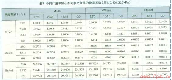 在計(jì)算熱值和華白數(shù)時(shí),有些地區(qū)和國(guó)家常采用的參比條件為60℉、60℉、14.73psi,由表5可以換算為15.6℃、l5.6℃、l01.586kPa,通過(guò)氣體狀態(tài)方程PV=nRT計(jì)算,基本可以認(rèn)為該參比條件等同于15℃、l5℃、101.325kPa。因此在實(shí)際應(yīng)用中,建議直接用后者進(jìn)行不同參比條件的換算。