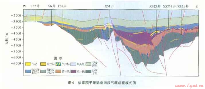 摘 要 松遼盆地徐家圍子斷陷下白堊統(tǒng)營城組四段致密砂礫巖儲層是該區(qū)深層天然氣勘探的儲量接替層系之一,為預測其有利勘探區(qū)帶,應用高精度層序地層學方法,研究了營四段層序地層與致密氣藏形成的關系。①根據(jù)地層發(fā)育特征、地層旋回性和巖相發(fā)育特征,將營四段劃分為2個三級層序,每一層序界面都有明顯的地震響應、測井響應和沉積學標志特征。②建立了營四段層序地層格架,營四段下層序(Sql)分布僅局限在斷陷中心部位,發(fā)育半深湖一扇三角洲前緣亞相,以暗色泥巖為主,其為優(yōu)質的烴源巖,可為上覆營四段提供氣源;營四段上層序(Sq2)的辮狀河三角洲前緣亞相物性好,是主要儲層發(fā)育的有利部位。③構建了營四段致密砂礫巖氣藏的2種成藏模式:一種是沙河子組為烴源巖,斷裂為運移通道,砂礫巖與火山巖為儲層的下生上儲式成藏模式,有利勘探區(qū)位于興城、徐東和徐南地區(qū),預測天然氣資源潛力達450×108 m3;另一種是營四段下層序暗色泥巖為烴源巖,上層序砂礫巖為儲層,自生自儲或下生上儲式成藏模式,有利區(qū)位于斷陷中心的XS22井區(qū),預測天然氣資源潛力約為l00×108 m3。