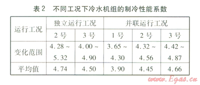 冷水系統(tǒng)基本處于定流量運行。冷水機組并聯(lián)運行工況為1號機組與2、3號任意一臺機組并聯(lián)運行,當(dāng)2號或3號冷水機組負(fù)荷率達(dá)到95%及以上時開啟1號冷水機組并聯(lián)運行。對測試數(shù)據(jù)進(jìn)行整理,得到不同工況下冷水機組的制冷性能系數(shù)(見表2)。冷水循環(huán)泵效率的變化范圍為73.16%~75.83%,平均值為73.78%。冷水系統(tǒng)輸送能效比變化范圍為0.021 5~0.029 9,平均值為0.026 3。