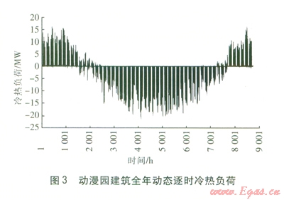 采用Energyplus模擬計(jì)算動(dòng)漫園建筑全年動(dòng)態(tài)逐時(shí)冷熱電負(fù)荷。全年動(dòng)態(tài)逐時(shí)冷熱負(fù)荷見(jiàn)圖3,圖中正值為熱負(fù)荷,負(fù)值為冷負(fù)荷。由圖3可知,全年最大冷負(fù)荷為20 532.8 kW,最大熱負(fù)荷為15 987.3kW。建筑全年各時(shí)段用電負(fù)荷(不含空調(diào)系統(tǒng)用電負(fù)荷)比較均衡,全年最大用電負(fù)荷為6 883.5 kW。