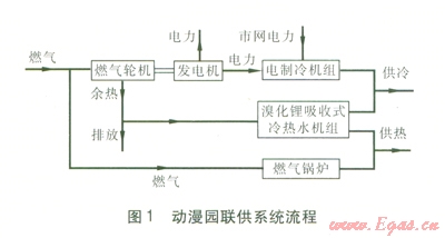 動(dòng)漫園聯(lián)供系統(tǒng)流程見(jiàn)圖1。聯(lián)供系統(tǒng)由燃?xì)廨啓C(jī)發(fā)電機(jī)組(以下簡(jiǎn)稱發(fā)電機(jī)組)、溴化鋰吸收式冷熱水機(jī)組(以下簡(jiǎn)稱吸收式機(jī)組)、電制冷機(jī)組(離心式冷水機(jī)組)和燃?xì)忮仩t組成。發(fā)電機(jī)組發(fā)電和市政電網(wǎng)電用于滿足建筑的電負(fù)荷。電制冷機(jī)組所需電量?jī)?yōu)先采用發(fā)電機(jī)組發(fā)電,不足部分由市政電網(wǎng)補(bǔ)充。發(fā)電機(jī)組發(fā)電量作為自用,不上網(wǎng)銷售,發(fā)電余熱驅(qū)動(dòng)吸收式機(jī)組向建筑供熱或供冷。當(dāng)供熱量不足時(shí)由燃?xì)忮仩t補(bǔ)充,制冷量不足時(shí)由電制冷機(jī)組補(bǔ)充。