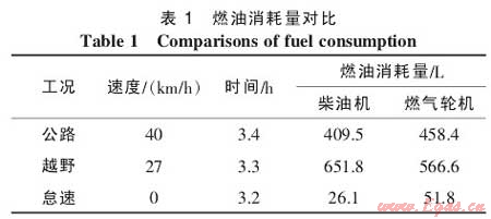AGT-1500燃氣輪機具有回熱裝置。按照車輛使用性質,美國陸軍分別在公路、越野、怠速3種不同工況下對柴油機和燃氣輪機進行實際試驗。表1為該實驗的部分數據。