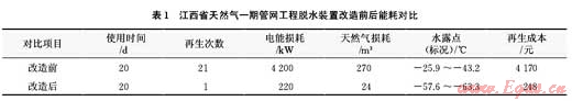 脫水裝置再生工藝流程由雙塔開式循環(huán)改造為單塔閉式減壓循環(huán)后,解決了由于再生飽和濕氣與工藝來氣存在交匯點(diǎn),致使冷凝出的水合物大量積聚在前置過濾器中,導(dǎo)致工藝來氣在進(jìn)入到吸附塔前含水量陡增的問題。改造后的脫水裝置較改造前吸附能力顯著提升,再生頻率大幅降低。與此同時(shí),減少了再生過程中天然氣和電能的損耗,節(jié)能效果較為顯著。以目前江西省天然氣一期管網(wǎng)工程加氣母站年產(chǎn)量計(jì)算,每年可節(jié)省約10×104元的生產(chǎn)成本(表1)。
